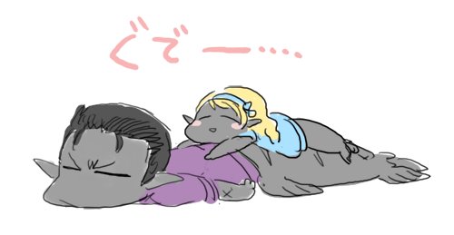 【ハッシュタグ消化】@るる缶さん(@Arlequin_clown)ちのアルルカンさんとうちのサブマの水獣繋がりツーショット!!多分この後捕獲されます(笑) #アットマークを打って出た人のおねがいを聞く本人が気付かなきゃ回避