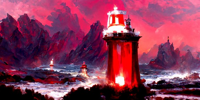 text_prompts=["A beautiful painting of a singular lighthouse, shining its light across a tumultuous sea of rock by greg rutkowski and thomas kinkade, Trending on artstation.", "red color scheme"]