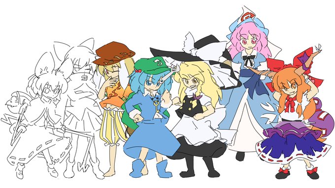 第15回東方project人気投票支援絵 #東方 #第15回東方project人気投票 #にとり #幽々子 #魔理沙 #鈴瑚 #赤蛮奇 #萃香 #ナズーリン https://t.co/IxazxwLb5C