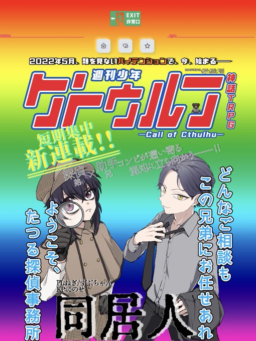 NOBODY*2 HO3:追跡する探索者 緒環 壮司朗(おだまき そうしろう) 素敵な立ち絵はSKIMAにてねぎま様に依頼させて頂きましたっ! マッキーです、対ヨロ💻😎✨