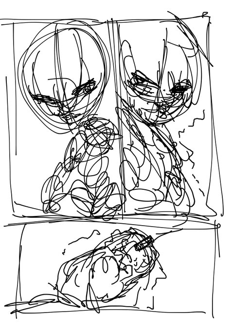 すっごいまだまだできてないんですけどボーマスで出る本は投稿している四コマ一章分の合間合間に2~4ページほどの漫画か設定案を描き下ろす予定です。 四コマの枠じゃ描き切れないマスターとミクの設定の深堀りっぽいやつです しっかし汚いラフだな