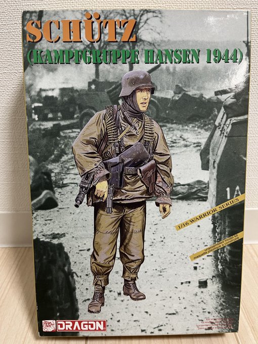 ホビーカンスケさんで入手したプラモ、もう一つがドラゴンの1/16 武装親衛隊擲弾兵(ハンセン戦闘団 1944)のキットです。 1944年ごろの戦争末期の武装親衛隊の兵士を再現したキットで、頭に防寒着のトークを身につけ、MG42機関銃と米軍から鹵獲したと思わしきM1911拳銃を所持しています