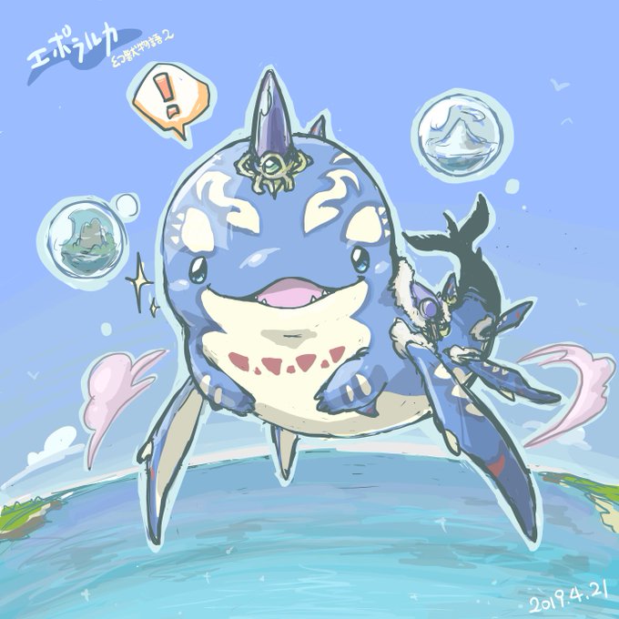 幻獣物語2でキャンペーン中のプレミアムチケットで交換できるアイテム『泡沫の至宝』。これで変化できる『エポラルカ』をデザイン担当させて頂きました!空飛ぶシャチ!