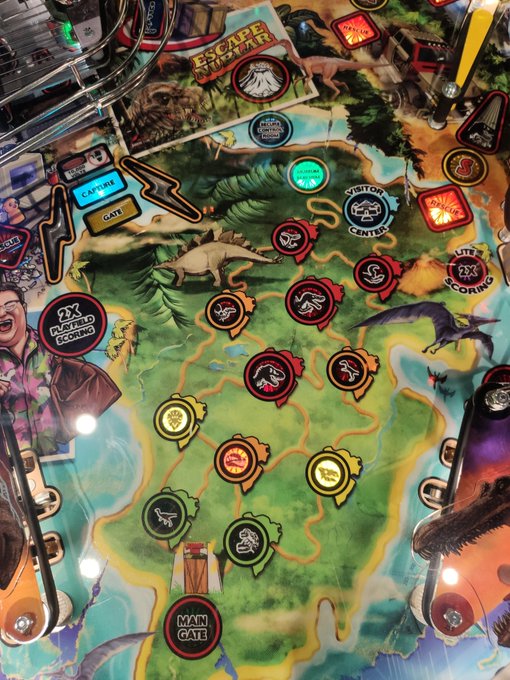 逃げ出した恐竜達を捕獲しながら島からの脱出を目指すゲーム、ルートはトラックターゲットの向きで変えられる 捕まえた恐竜ごとに固有のPERKS、特典がつくので選択も大事 CHAOSマルチボールはやはり稼げますね、スマートミサイルはハリーアップモードになってます めちゃ面白いです!