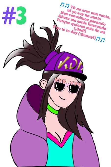 (3/159) Le llego la hora a Akali. Se quería despejar del Kpop y fue a un concierto de Bad Bunny, llegó muy tarde y le salieron ojeras por eso los lentes, definitivamente no se los coloqué porque NO se dibujar rostros aún, pero definitivamente hubo una mejoría, lol.