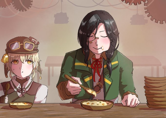 これも結構前にラフを描いたままだったので色つけました。捏造MAXですがリンクもシェリンさんと同じ大食漢だったらいいな。#黒鉄のフォークロア