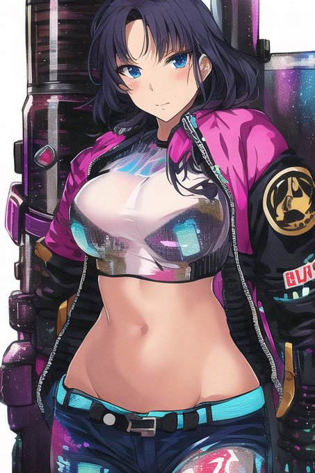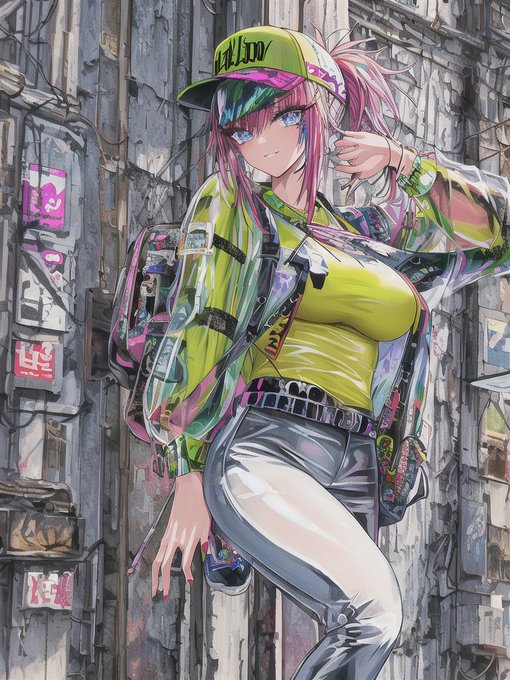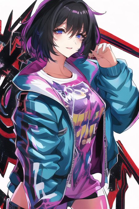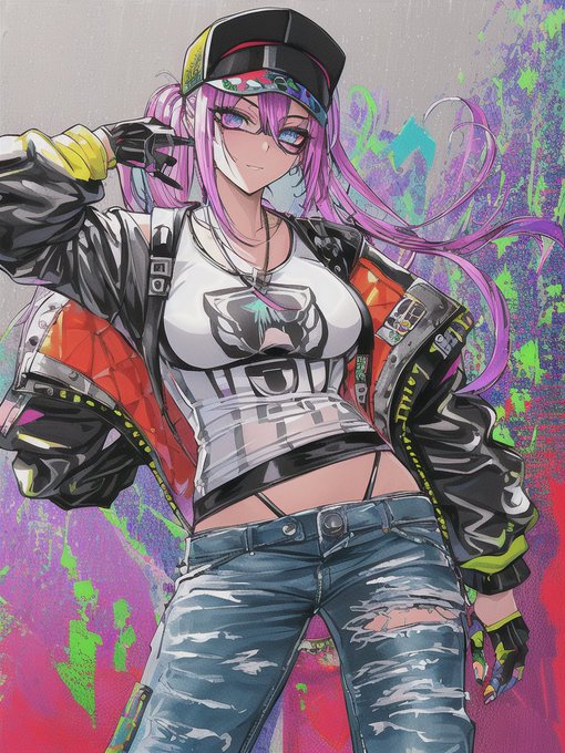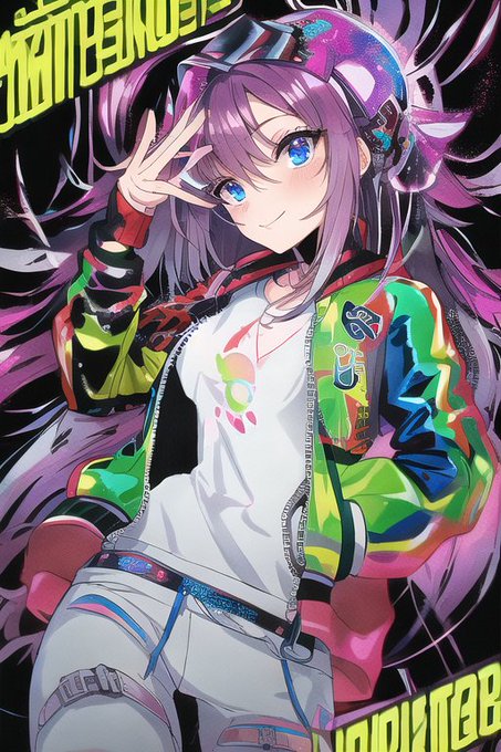 「なんか透明のbomber jacket作っとくれ。ホログラフィックなエフェクト付き。あ、画風とかこんなんでスレンダー気味のお姉さんに着せとくれ(意訳)」 ってやった結果がこちら。 acid punkにgraffitiとvivid tone乗せるの面白いな……! #NovelAI #AIart #AIイラスト