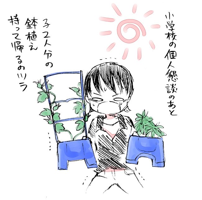 車で行っていたとはいえ、車を停めたとこに行くまでが重い。 前を行くママさんが鉢3つ持ってたような気がするけど錯覚だったかな… 無理じゃない?鉢3つ… #のむのむ絵日記