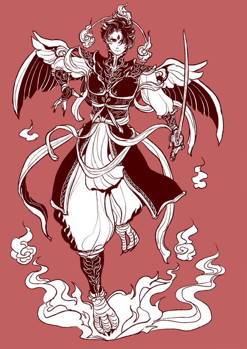 竜神ノ介に合わせて。火鳥双義。 仏教の守護神、天竜八部衆の迦楼羅をイメージしています。漢訳では食吐悲苦鳥と呼ばれ、口から金の火を吹き、鳳凰のように美しい姿で赤い翼を広げると336万里にも達する。悪龍や毒蛇を喰らうというのも逆転すると龍ノ介や己を飲み込もうという内面を表している。