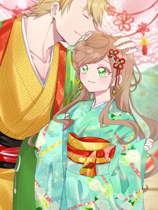 こだまさんのアバターを描かせていただきました! 青味のある翠色の着物に大きな編み込みヘアーが可愛すぎるし、髪飾りと帯が赤と金で差し色になってて素敵🥰 秀吉さんと並んだ時のお似合い感〜〜〜! #あなたのアバター描かせろください
