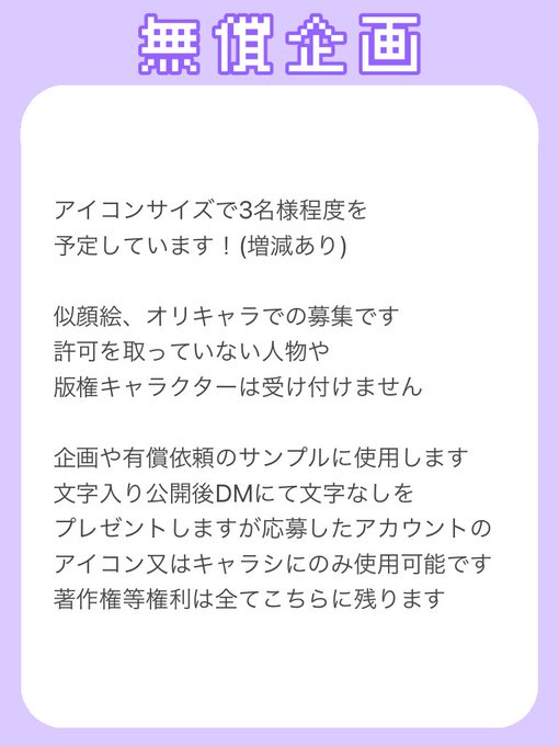 参加ありがとうございました! 今回はこの3名様を描かせていただきました!文字なしはDMに送信させていただきます! アイコン、キャラシのみ使用可能です!よければ使ってやってください! 投稿される場合はメンション頂けるとありがたいです! @Morinmiku @Crm02__loveca @yuji__my
