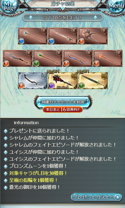 今日のガチャ60連(30連×2)で風メーテラさんと金月1つが来てまぁまぁ勝利だけど、それなら昨日のうちに光メーテラさんが来てくれたらよかt