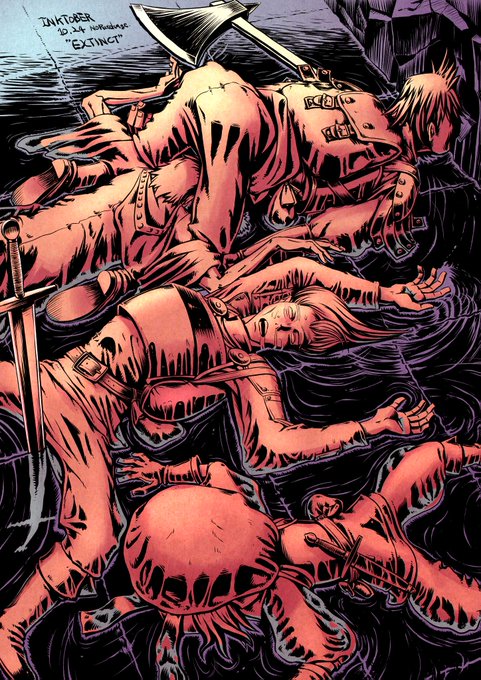 公式お題「EXTINCT(絶滅!)」 冒険者は全員、DEXロールに失敗して水攻めに捕まった模様...冒険者よ、恨むならお題を設定したInktober公式を恨めよ! んで、ずぶ濡れ表現難しいです。