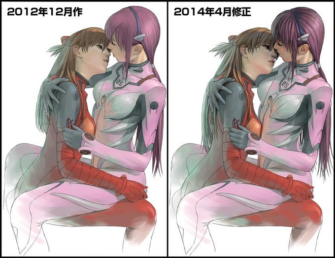 昨日、1年前に描いた絵の線画の修正をアップしましたが、これはその絵の修正塗り作業を少し進めた段階(アスカの顔のみ塗りを修正)。1年前の絵と比較すると恥ずかしいくらいおもしろい。