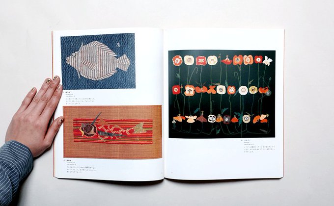 端切れを合わせ縫って描いた植物や魚などの作品を収録。