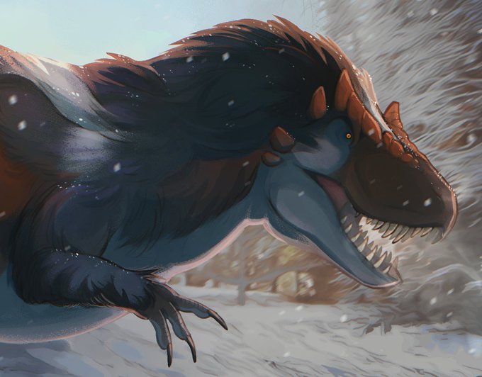 I saw snow for the first time a few weeks ago, and drew a big fluffy Yutyrannus to celebrate ❄️🍗