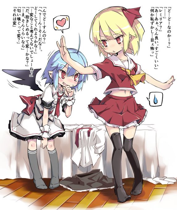レミルミ(フラ)。レミリアとルーミアは仲良しだといいなー。たまに人里ほっつき歩いては、バイトしてるルーミアとあって挨拶する程度の仲。紅魔郷でもルーミアが遅延戦術として霊夢に当たったみたいな?