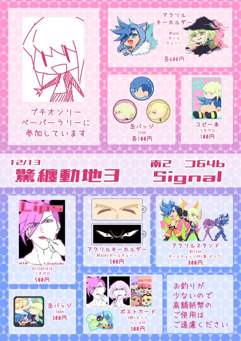 明日12/13の驚纏動地3に参加いたします スペース:コ64b 新しいものはないです、リガプチオンリーのペーパーラリーに参加してます 当日はスケブもTwitter上で受付予定です 明日はよろしくお願いします