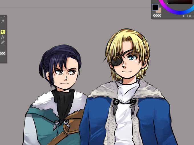 ディミギのサークルカットにしたくてフェリくんと殿下の絵を色塗りしてみた~~んだけどなんか顔丸くね!??!ってなった… いま手癖で描いたらこんな感じになるってことなのかな……!?