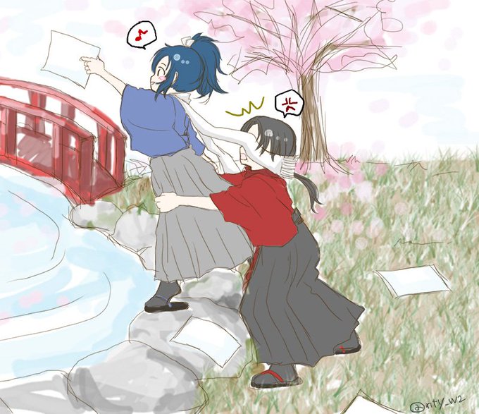【 #清安ワンドロ 】 (@kiyoyasu_60min) お題:春一番 風で飛ばされた書類を追いかけて…。このあと、仲良く落っこちますwww