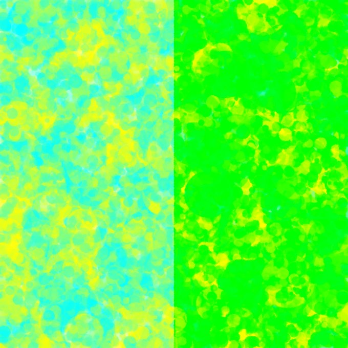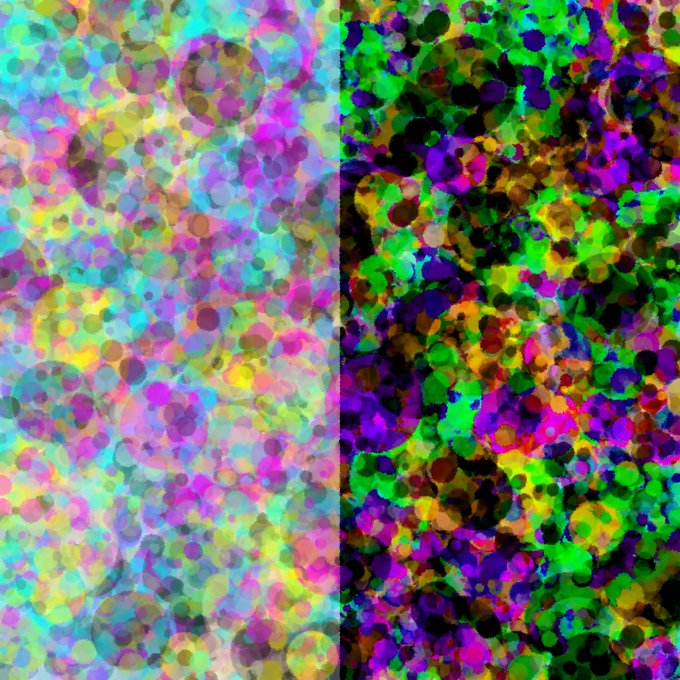 Testing additive (RGB + RGB on the left) and subtractive (RGB -> RYB -> RGB on the right) color mixing. The results using this method are a good bit closer to paint or ink! And yellow + blue is indeed green. Code link in the next tweet ... #generativeart #wip