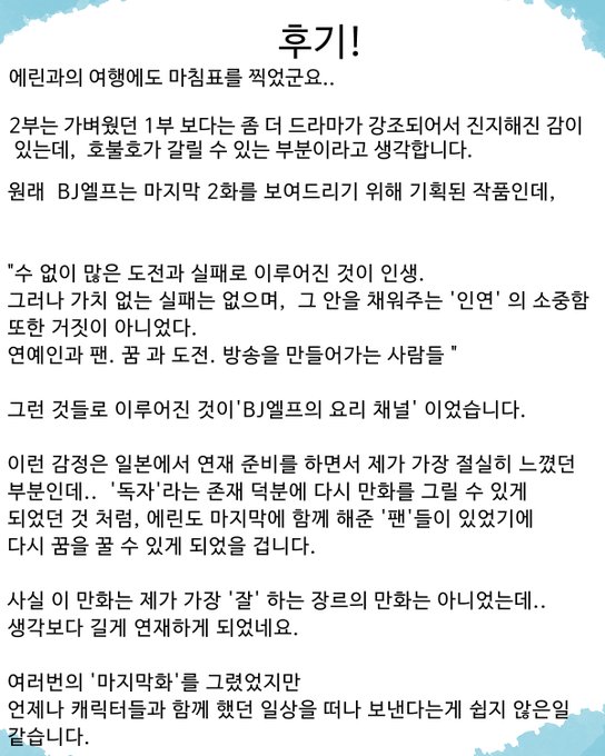 뒤 늦게 올리는 BJ엘프의 요리 채널 완결 후기! 만화내에 후기 같은 글을 올리기 싫어해서 블로그와 트위터에 대체로 올립니다! 짧으면서도 긴 시간 함께 해주셔서 감사합니다!