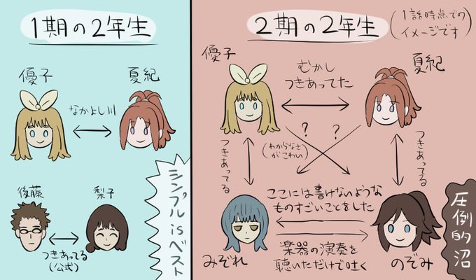 『響け!ユーフォニアム2』、まだ1話目なのに(1期では比較的平和だった)2年生組が一気に底なし沼と化してしまった気がするので、1と2での印象の違いを相関図にまとめてみました…(個人の感想です)。なんにせよ今夜の2話目が楽しみです。誰も死なないといいんだけど…。 #ユーフォきてる