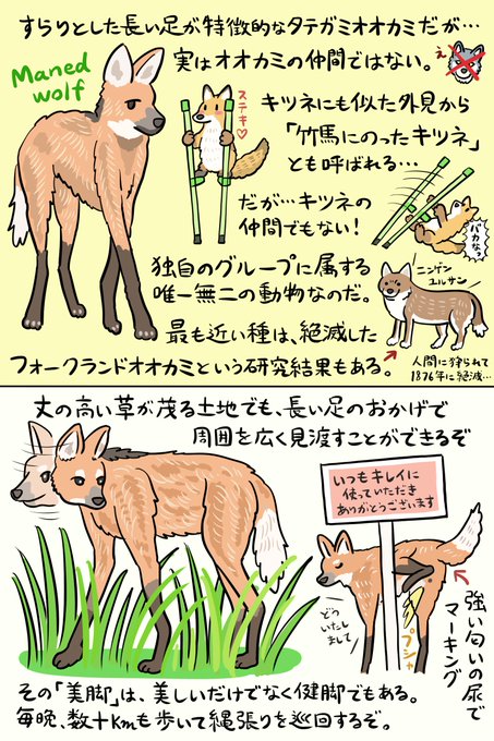 →オオカミでもキツネでもないユニーク動物「タテガミオオカミ」ですが、図解にも書いたように、最も近い関係にあるのが19世紀に絶滅した「フォークランドオオカミ」という研究結果もあります。『絶滅どうぶつ図鑑』で図解していたのでこっちも読んでみてください。言われてみれば生息地もわりと近い。