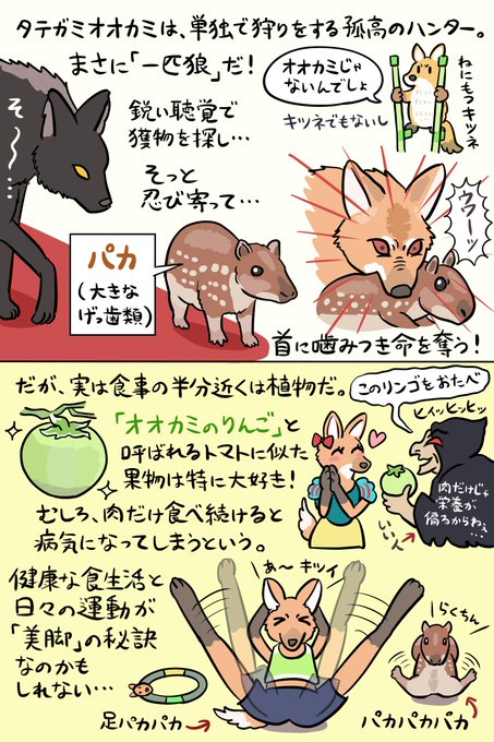 美脚のイヌ科「タテガミオオカミ」の生態を図解しました。すらりと長い脚で南米のサバンナを歩き回る、オオカミのようでオオカミじゃない(キツネでもない)不思議な動物です。意外とヘルシーな食生活にも注目!