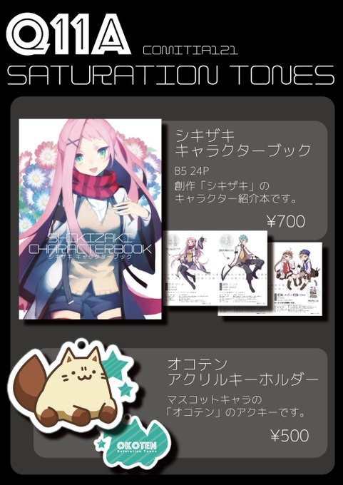 20日のコミティア121のお品書きです!私と五月七日( @Tsuyuri0507r )、66299( @_66299 )の3人で制作した共同創作のキャラクター紹介本とそのマスコットキャラのアクキーです。スペースは【Q11a】です!よろしくお願いします~