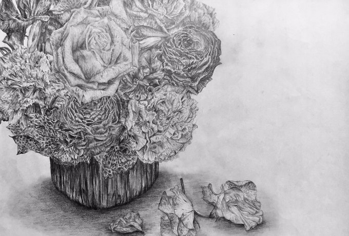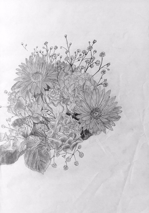 前までよく母への誕生日プレゼントにお花の絵を描いてた。最初にプレゼントしたのは小2の時で作品は色付き、小4からはずっと白黒で描いてる。3枚目の絵は中1の時のだから反抗期で未完になってしまったのかもしれない😇