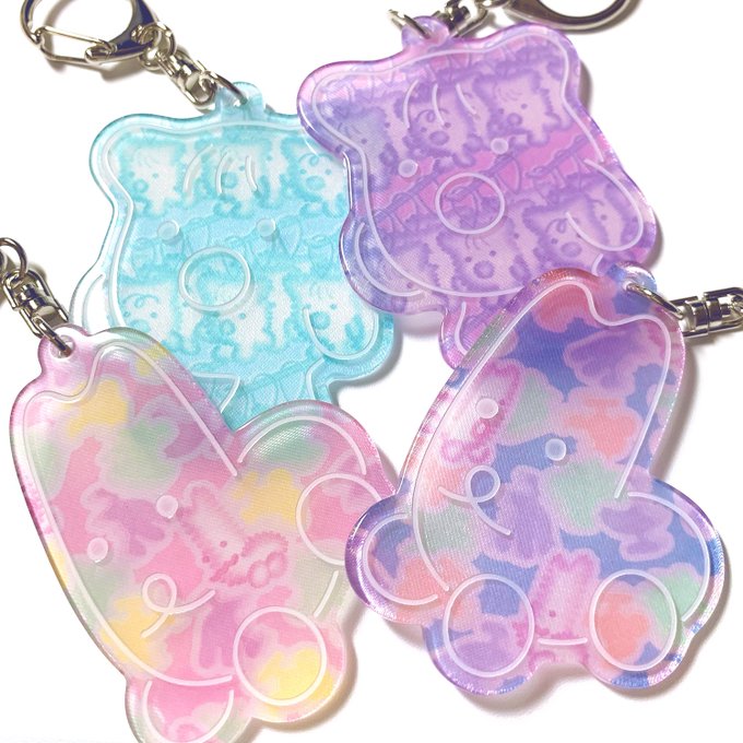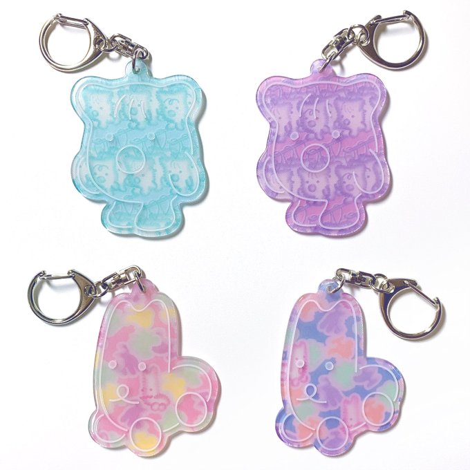 🍏個展『ヌミヤゲヤ』グッズ🍏 今回の展示で誕生したキャラ『ヒトビト』と『カムカム』デザインのテキスタイルを封じ込めたアクリルキーホルダーです🍌🍓🍈白線はレーザー彫りです。なめらかツヤツヤで美味しそう…! https://t.co/ivCxM4EHQW