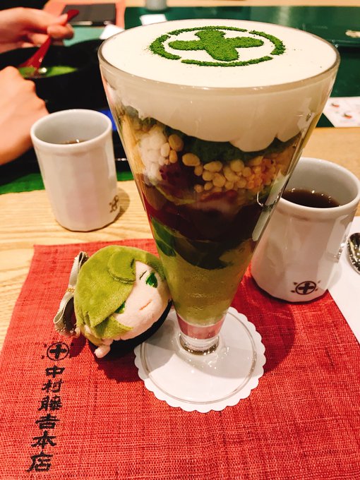 絵は再掲で申し訳ないですが…… これはさっき&先日食べてきたチャアのパフェ🍵 鶯丸、これからも大好きです #5月5日は刀帳番号55番鶯丸の日