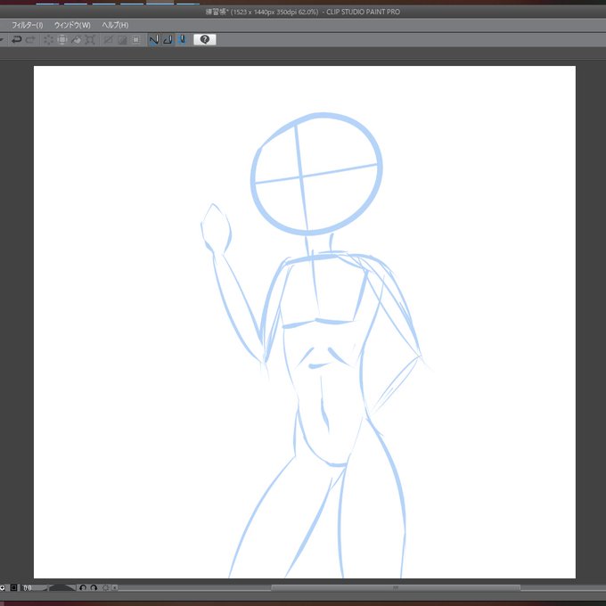 ①あたり(大体の長さを測りながら雑に棒人間みたいのを描く) ②長さとかを微調整しながら肉を付けてみる(衣類と裸はレイヤーを分けておく) ③もうちょいちゃんと顔とかを描き込んでみる(ここでもバランスを調整したりする) ④ラフを描いてみる(これは場合によっては何回もやり直す) 線画へ…