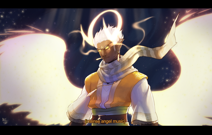 An aasimar being a badass-- it's @mallimutt 's shiny cleric Ellyon! A ray of sunshine~ he's very kind and very soft.
