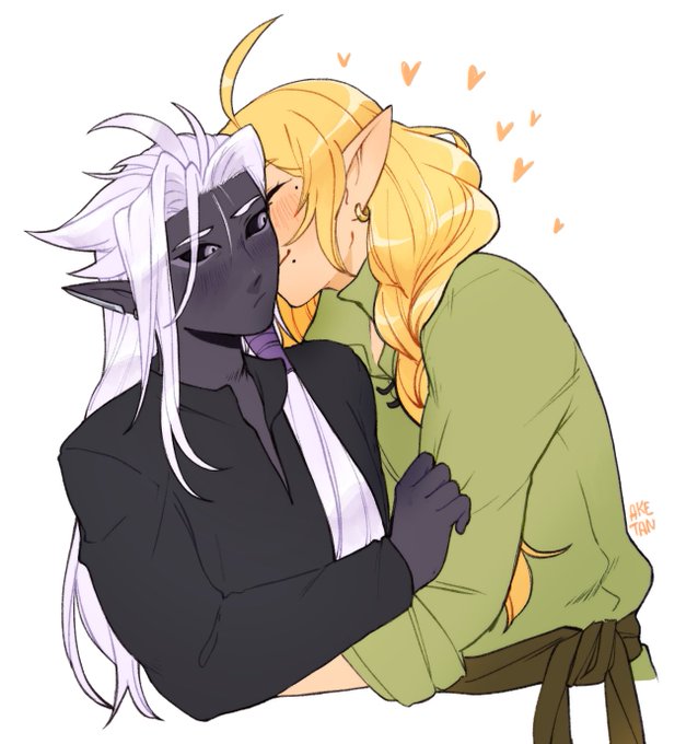 It's @hanni_drops 's drow Callisto... and he's getting soft kisses from his silly golden dragon boyfriend Tisiryn~ 💜💛