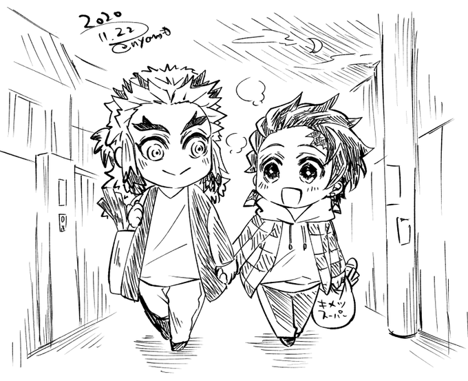 今日のごはんはお芋祭りですよ☺️🍠🥰 とか話しながらおてて繋いで近所のスーパーで買い物いってほしい夫婦の日な煉炭落書き