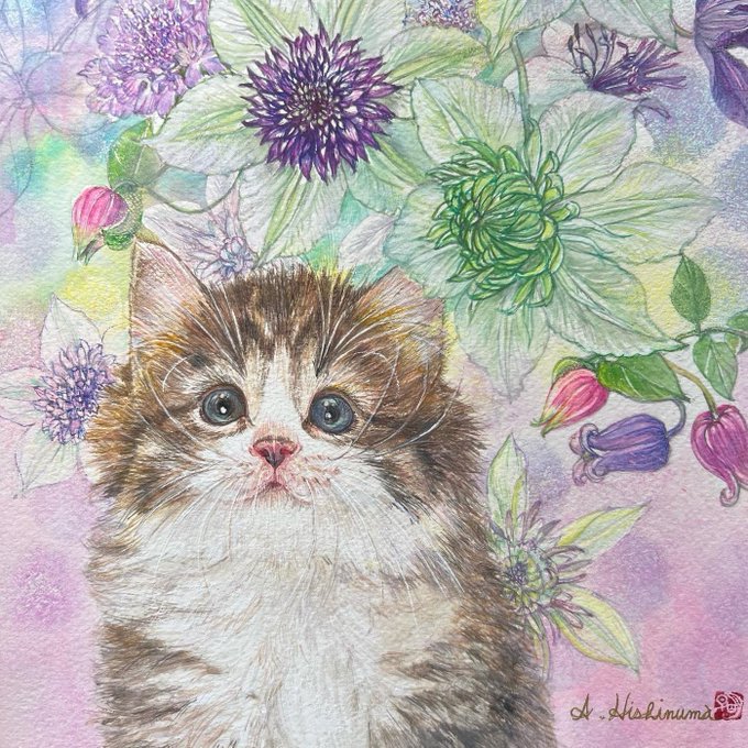 暮らしの中に癒しと潤いをもたらす美しい花と猫の絵。