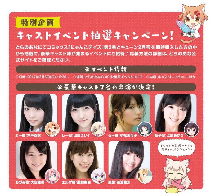 【イベント抽選キャンペーン】とらのあなにて、現在発売中の「にゃんこデイズ②」と「コミックキューン2月号」を同時購入した方の中から抽選で、豪華キャスト7人が集まるイベントにご招待♪ とらのあな特設サイトで応募方法を要チェックにゃ!⇒https://t.co/IombKmFz91