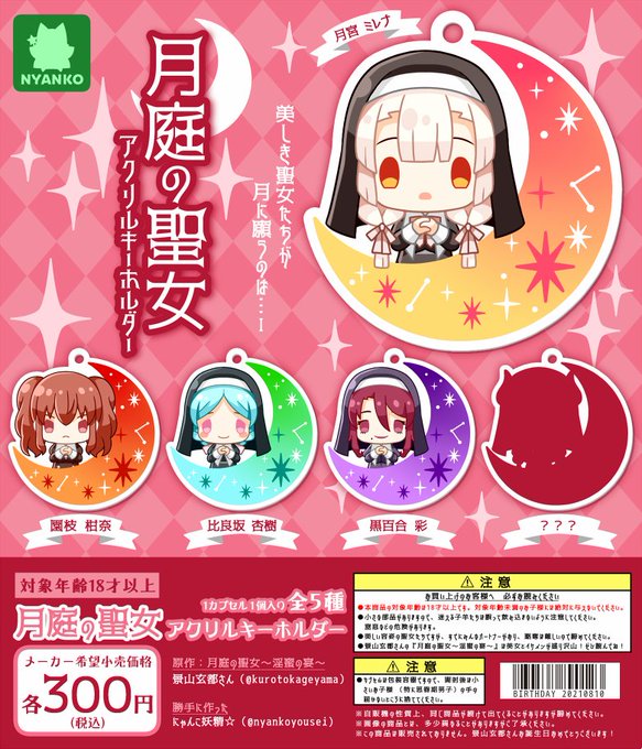 景山玄都さん(@kurotokageyama)お誕生日おめでとうございます! 勝手ながら『月庭の聖女~淫蜜の宴~』のアクリルキーホルダーガチャを作ってみました。 楽しい1年を過ごしてください~!