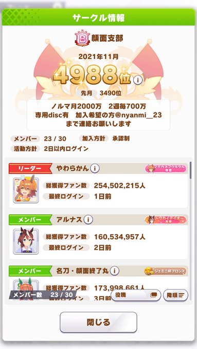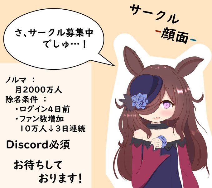 サークル「顔面」メンバー募集しております (本部:4名、支部:6名) 支部はノルマが2000万です Discord必須となりますが、ちょびちょい雑談とか攻略とかしてるのでぜひ🤗 ココだけしか見られない㊙情報も!? DMでご応募よろしくお願いします! #ウマ娘 #ウマ娘サークルメンバー募集
