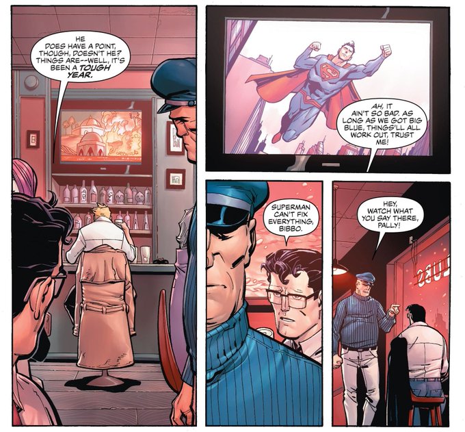 콘스탄틴이 정확하게 짚었어요.그렇지 않나요?정말...음,정말이지 힘든 일 년이었죠. 아,그렇게까지 나쁘진 않았어.슈퍼맨이 있는 한 전부 괜찮을 거라고.날 믿어. 슈퍼맨이 모든 걸 해결할 순 없어요. 이봐,말 조심해.