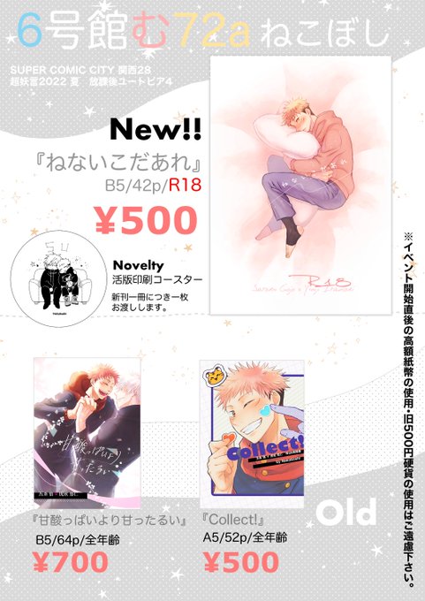 ⭐️8/21インテのお品書きです〜!⭐️ 6号館む72a「ねこぼし」全部五悠です❣️ ノベルティは新刊一冊に一枚お渡しします。 開始直後は本人不在ですが多分売り子がいてくれる…はず…!よろしくお願いします〜!🙇♀️