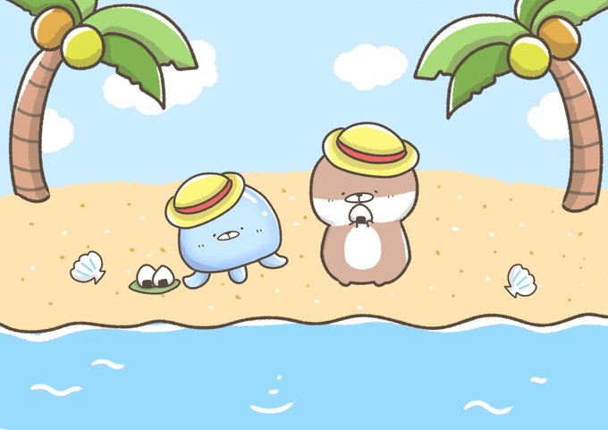 2人で南の島に来ちゃった🌴🏖 浜辺で食べるおにぎりは格別だね! #イラスト #お絵描き #一日一絵 #まるにょん
