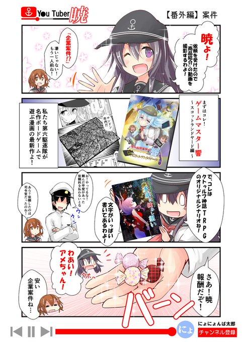 艦これの響たち第六駆逐隊が様々なアナログゲームに挑戦する漫画「ゲームマスター響」毎週木曜日にWEBで更新中の、暁がY●utuberを目指す「ゆ~ちゅ~ば~暁」 クトゥルフ神話をはじめとしたTRPGのシナリオなんかを作ってます。もっと広まれください! #私の作品もっと沢山の人に広がれ祭り