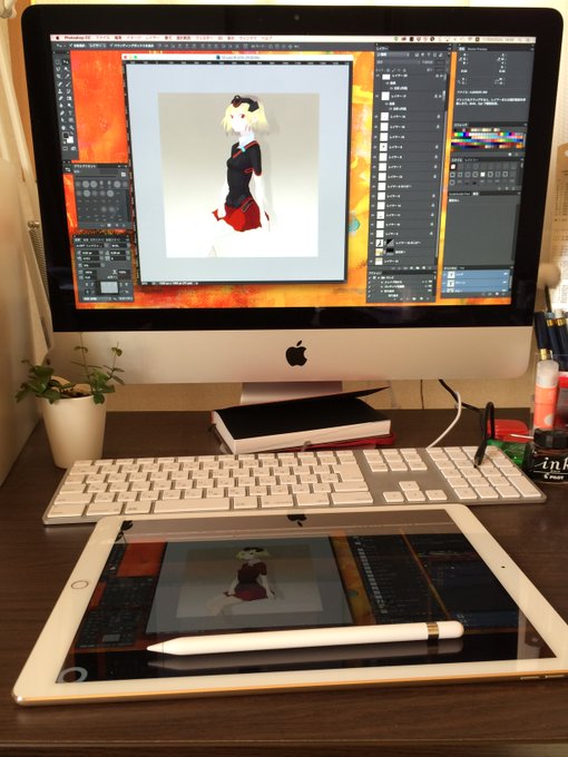 ApplePencilやっと届いたー!のでちーちゃんで試し書き。Astro Padというミラーリングアプリを使ってPhotoshopCCをiPadに表示、ほぼ液タブ状態で下書きから塗りまで描きました。