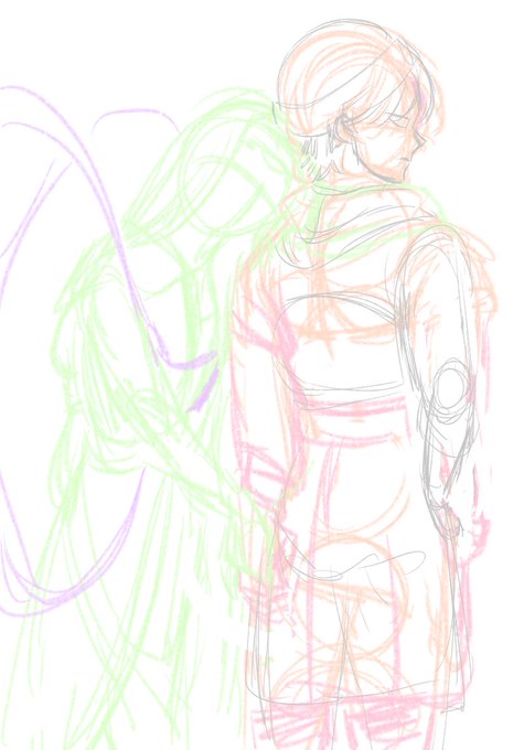#このタグを見た人はラフ画とその完成絵を見せる デジタルだとラフと下書きの違いが曖昧。 比較的ラフ感あるレイヤーが残ってた2枚。