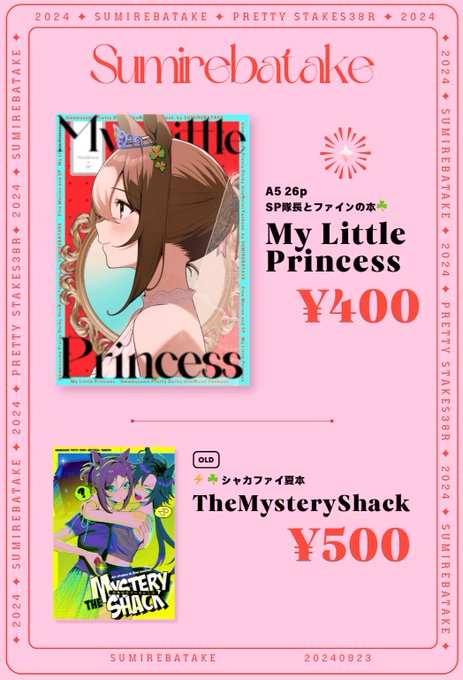 明日プリティーステークス38Rのお品書きです。 ファインちゃん(&SP隊長の)新刊と夏コミのシャカファイ既刊の2種です。 🏁ウマ13でお待ちしております!