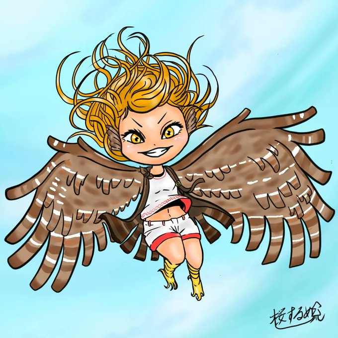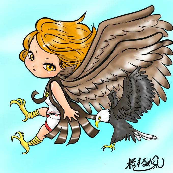 生き物×女の子 人に翼を生やすなら背中か、腕を翼にするか、 うーん、どっちも好き🎵 ということで両方描きました。 鷹のイメージです。 #ミニキャライラスト #鷹擬人化 #イラスト好きな人と繋がりたい