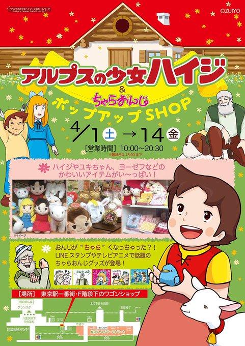 東京駅一番街にて期間限定「アルプスの少女ハイジとちゃらおんじポップアップSHOP」がOPEN! (場所)東京駅一番街・地下1階[F]階段下のワゴンショップ【ホームページ】https://t.co/AvkAeOSZTG